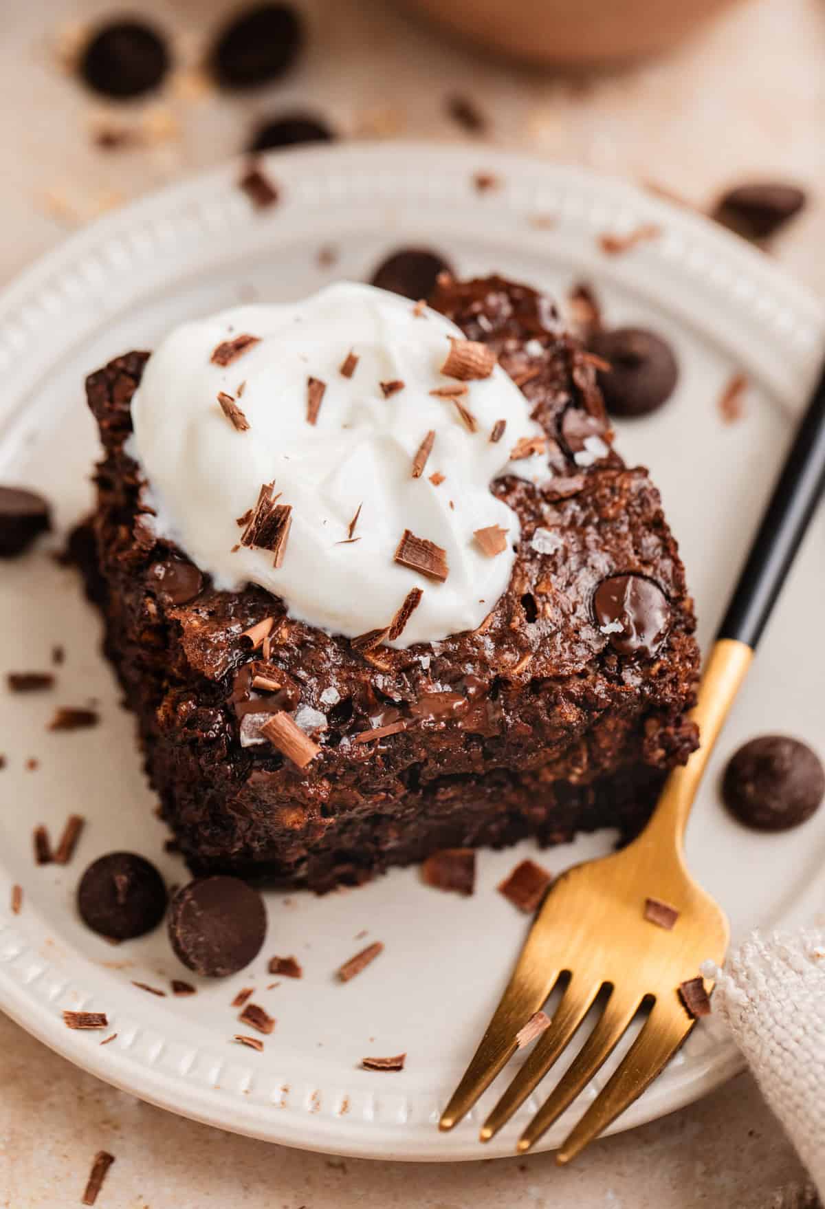 These baked oats will be the most fudgy freshly baked. The chocolate chips will be nice and melty and the oats have the most moisture. Eat up then for sure, but also you can store leftovers at room temperature for about 3 days in an airtight container. You can refrigerate for about 5 days, but this can dry them out a bit more.