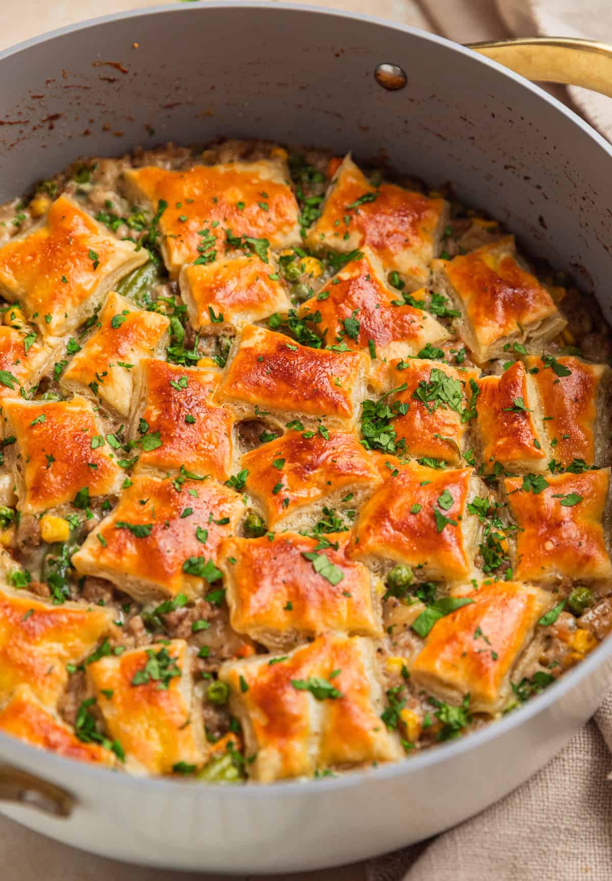 For an even quicker prep option, you can use shredded rotisserie chicken, leftover turkey or already browned meat. If you already have meat in the fridge to use up, you can simply toss all of the ingredients together in a greased pan and then top with the puff pastry pieces. Bake until bubbling and the puff pastry is golden brown. This makes for a great way to use up leftovers!